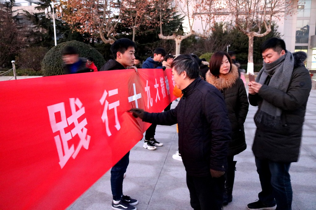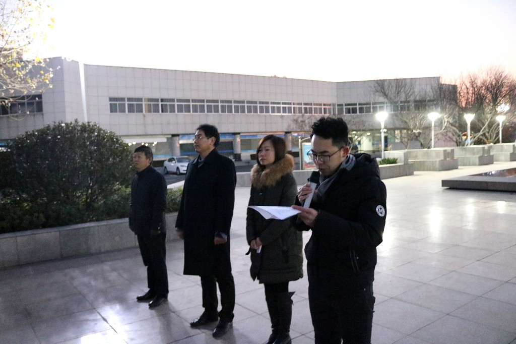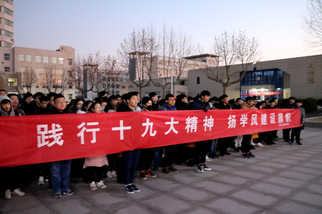 12月11日清晨,学院举行了“践行十九大精神,扬学风建设旗帜”主题升旗仪式。党总支书记李树安、副经理马卫兴、经理助理李海南、党政办主任温德育、分团委书记王博和全院员工参加了活动。